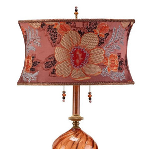 This floor lamp, Michael, features burgundy and salmon colored blown glass and a round taupe colored shade with embroidered burgundy and salmon floral design. The solid brass and copper elements are finished with techniques that will ensure they will never chip or discolor.