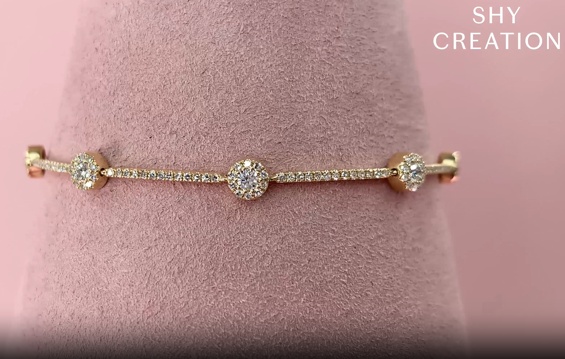 The Diamond Pavé Station Bracelet by Shy Creation blends refined structure with continuous sparkle. Crafted in 14K yellow gold, delicate pavé diamond bars are connected by round diamond stations, creating a balanced, geometric rhythm.