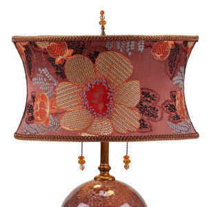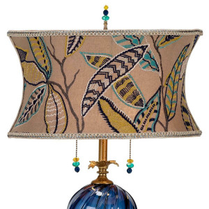 The table lamp, Emilia Seafoam, is a softly colored lamp with large sea foam colored blown glass in its base; its simple oval shade is covered with a sea foam color embroidered fabric in an abstract leaf pattern. Emilia has a double bulb socket and is finished with beaded pulls and a beaded finial.