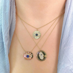 This captivating piece showcases a delicate Evil Eye design accented with vivid blue diamonds and adorned with six exquisite white diamond pendants, reflecting protection and positive energy. Crafted with meticulous attention to detail, the 14kt gold setting enhances both the brilliance of the diamonds and the intricacy of the design, expertly blending spirituality and luxury. Whether worn as a meaningful symbol or a statement accessory, this piece is an excellent addition to your jewelry collection.