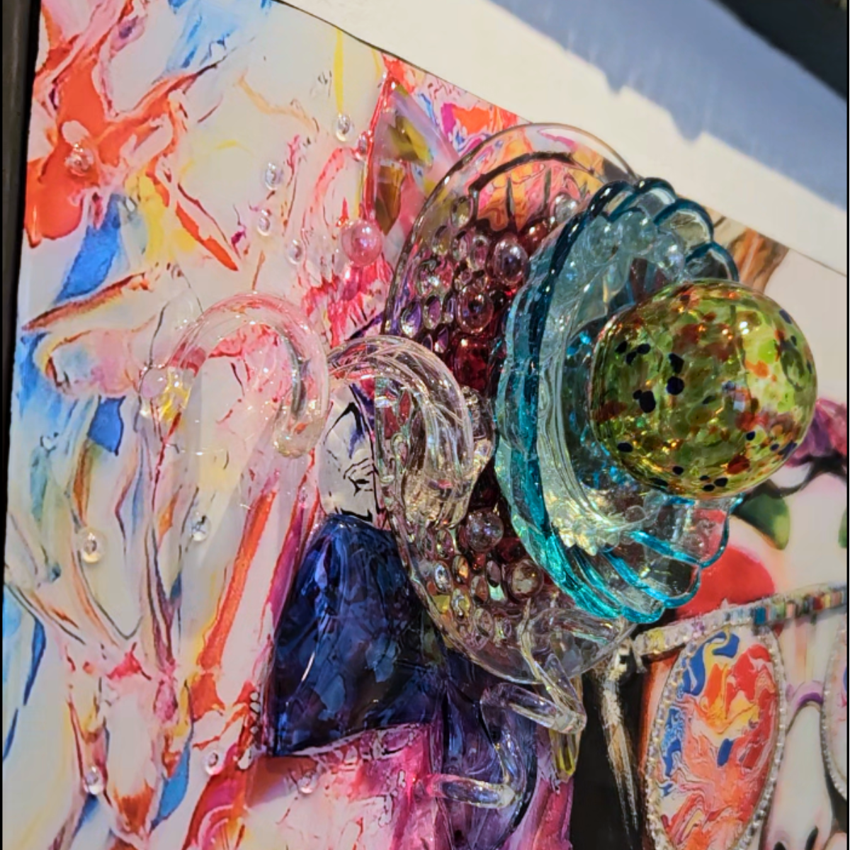 Mixed Media Giclee piece comprised of Acrylic, foil, glass and resin on board-mounted canvas. Please note each piece will vary slightly in color and styling.