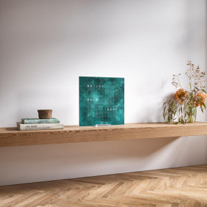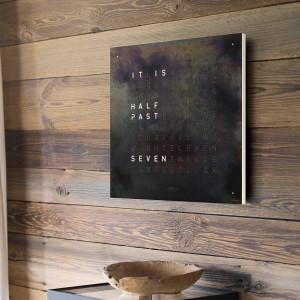 QLOCKTWO Earth 45 tells time with words: "IT IS A QUARTER PAST SEVEN." The words change in five minute increments, with four small illuminated corner points displaying the minutes in between. The front cover is available in a selection of colors, languages and materials and is held in place by magnets enabling it to be easily exchanged at any time. If the connecting power cable is visible the colored textile cable can be added on as an additional design element.