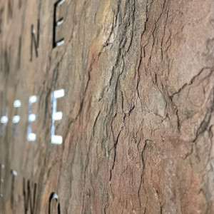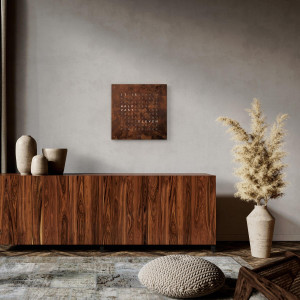 The front of the QLOCKTWO EARTH 90 CREATOR'S EDITION GLINTSCAPE made of million-year-old sedimentary rock fascinates with a unique relief of random irregularities and a pearlescent surface. With its tones of green, red and gold, the object is reminiscent of an autumn landscape reflected in a sparkling lake. The precious natural stone enters into an extraordinary union with the poetic time display of the QLOCKTWO, creating a unique art object.