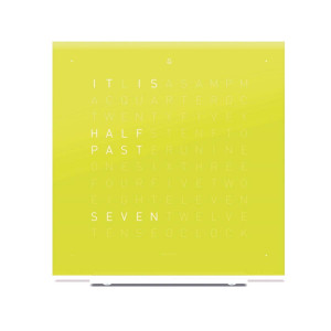 QLOCKTWO EARTH 13.5 PURE is a table/desktop alarm clock that tells time with words. The words change in five minute increments, with four small illuminated corner points displaying the minutes in between. The alarm reliably wakes or reminds you—first gently, then persistently. If active, the alarm can be delayed or deactivated by touching the top of the case. The front cover is available in a selection of colors, languages and materials and is held in place by magnets enabling it to be easily changed at any time.