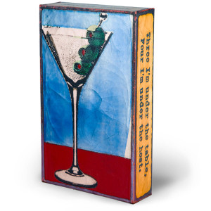 This Spiritile features a tall martini with three green olives set on a bright red table. Each Spiritile is made from copper, glass and wood. They can hang on a wall or stand alone, and will never fade or tarnish.