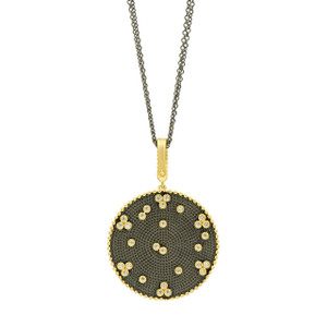 This iconic pendant is a statement maker! Inspired by Brooklyn, this Signature pendant necklace features a double-sided design for a two-in-one style, depending on your occasion or mood and is suspended from a black rhodium link chain. One side adorned with sparkling pave stones that catch the light, enhanced with matte gold "train tracks". For a more subtle, daytime look flip this pendant over to reveal a textured black rhodium surface embellished with signature sparkling clover designs and single stones bezel-set in matte gold. This pendant is a true icon!