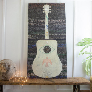 One of our most popular art prints, “Legends” features a guitar across two panels filled with lyrics from the pen of such music legends as Aretha Franklin, David Bowie, and Dolly Parton. This print is in tribute to the music, lore, and creative energy of the entertainment industry. Have a musician or music lover in your life? Gift them this tribute to music legends and their iconic songs. Available in 2 colors and 3 sizes. Excerpts from the piece are: