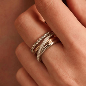 Discover sculptural elegance with the TI SENTO gold and silver ring 12394ZY. Crafted from 925 sterling silver with an 18KT yellow gold overlay, the design weaves two distinct bands into one fluid silhouette - a polished golden arc wraps around pave-set platinum-overlay rows, each set with brilliant white cubic zirconia.
